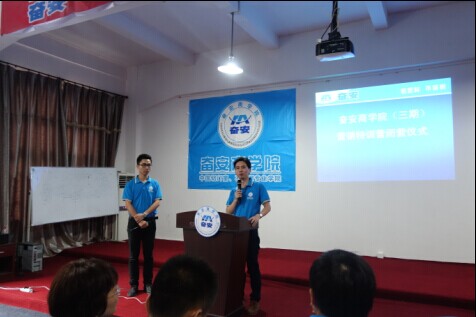 7月8日上午,當(dāng)?shù)谝豢|輕柔的陽光灑向大地,本次歷時六天的奮安商學(xué)院第三期暨營銷特訓(xùn)營如期開展。奮安商學(xué)院執(zhí)行院長黃秀華女士的開營演講給人啟發(fā)是良多的,她說,她是亮麗的,人走到哪里都要照亮別人。豹子的項鏈象征豹子的精神,虎的戒指代表虎的干勁,愛心手表時刻提醒自己做人要懂得感恩。幸福、家、責(zé)任、堅強(qiáng)、堅持,五個簡單的詞匯卻將難能可貴的“做幸福的奮安人”的精神展現(xiàn)給新一批的學(xué)員們。