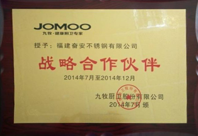 8月26日,奮安再傳喜訊,福建奮安不銹鋼有限公司榮獲九牧廚衛股份有限公司“戰略合作伙伴”榮譽稱號。希望奮安集團能收獲更多佳績!