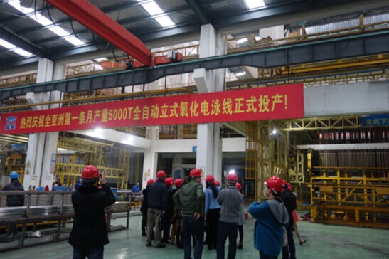 我司營銷總監黃磊和生產副總歐開干正為貴賓介紹我司全亞洲第一條月產量5000T自動立式氧化電泳生產線