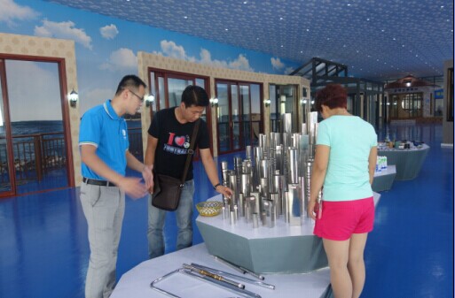 (石副總在全國最大的門窗體驗(yàn)中心向貴賓介紹奮安不銹鋼產(chǎn)品)