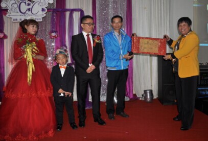 奮安大家庭為這個奮安小家庭送上了獨特的婚禮祝福:由奮安集團總經理黃秀華一家三口的“奔馳房車+奔馳車+寶馬”為主,10輛奮安獨具特色的業務車隊組成了喜慶、壯觀、獨特的迎親車隊;拍攝了“愛情童話”、“朋友祝福”、“父母期盼”、“小兩口幸福生活展望”等婚禮祝福視頻,向我們的新人送去了奮安兄弟姐妹們最真摯的祝福。黃總親臨婚禮現場為新人證婚,并要求“你倆要再接再厲,為我們的奮安儲備后續力量!”,讓全場的賓客都樂開了花。