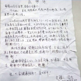 而讓我們感動和驚喜的是,奮安工會在了解到這一情況后,馬上倡議奮安集團全體員工進行愛心捐款。叔叔阿姨們的捐款從幾元到幾百元,在短短兩天內籌集善款47418.5元,并及時交至爸爸的手中。部分叔叔阿姨,由于上班原因沒來得及參與募捐,還親自送到了 我們家里。更有福清市總工會的愛心撥款及素不相識的其他公司的叔叔阿姨的愛心捐款。