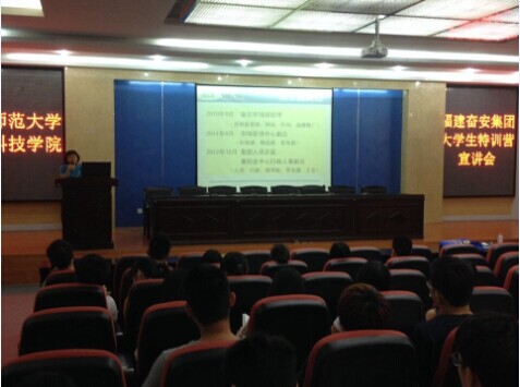 6月11日下午,奮安集團(tuán)一行四人前往福建師范大學(xué)閩南科技學(xué)院進(jìn)行現(xiàn)場(chǎng)招聘,為奮安商學(xué)院閩科院經(jīng)管系大三應(yīng)屆畢業(yè)生開(kāi)設(shè)大學(xué)生特訓(xùn)營(yíng)做準(zhǔn)備。在該學(xué)院邱院長(zhǎng)、經(jīng)管系陳主任、劉主任和校企合作辦劉主任的大力支持下,于下午14:30在學(xué)校圖書館一樓會(huì)議室舉辦了現(xiàn)場(chǎng)招聘會(huì),此次前來(lái)參加招聘會(huì)的學(xué)生超過(guò)100人。奮安集團(tuán)人資總監(jiān)陳凌芹女士詳細(xì)向大家介紹了我司的企業(yè)發(fā)展?fàn)顩r,現(xiàn)場(chǎng)互動(dòng)頻頻,氣氛融洽。